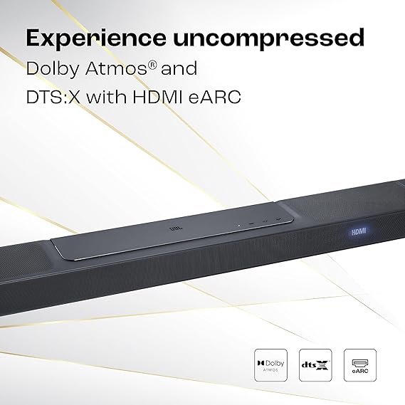 - Free Installation, Replacement & On-Site Repair within 24 hours ( in Select cities).T&C Apply;TRUE DOLBY ATMOS, DTS:X, AND MULTIBEAM SURROUND SOUND: Immerse yourself in theater-quality 3D audio. The JBL Bar 1300 delivers true Dolby Atmos and DTS:X, as well as MultiBeam for an enhanced 3D surround sound experience, thanks to four up-firing drivers in the main bar and two more in the detachable speakers
